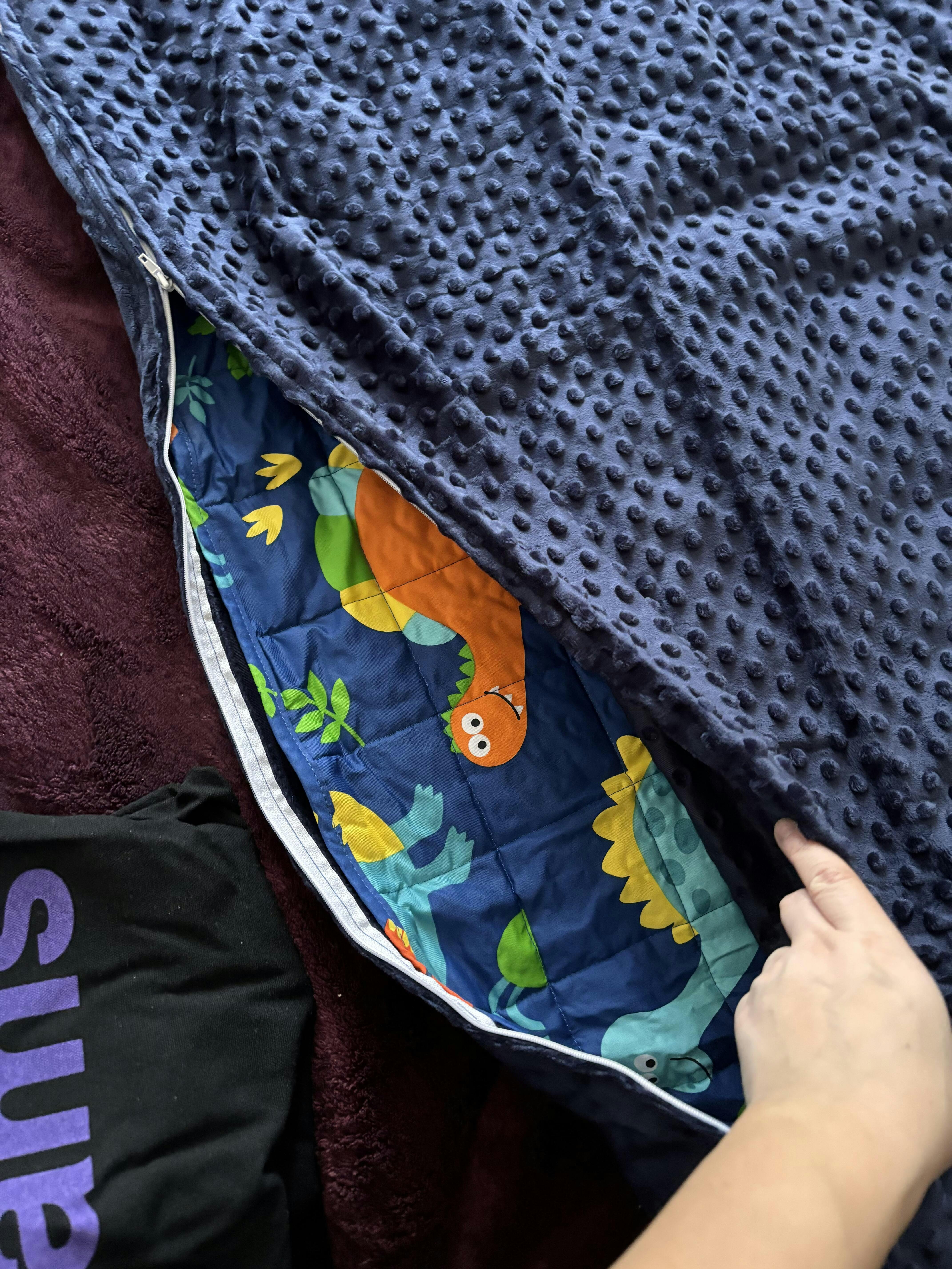 Für optimalen Komfort verwenden Sie einen Gewichtsdeckenbezug mit Bändern, um die Decke sicher und gleichmäßig verteilt zu halten.